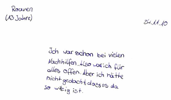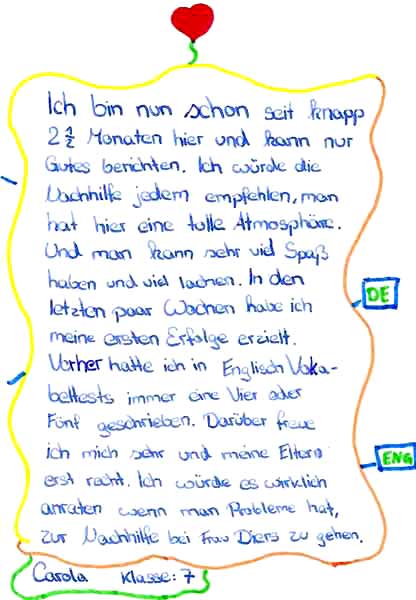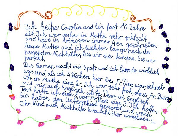 Nachhilfe-UnterrichtJeder Schüler ist etwas Besonderes Nachhilfe muss genauso individuell sein!Jahrzehntelange Erfahrung im Umgang mit unseren Schülern hat gezeigt, dass nur eine intensive Einzelbetreuung zu besseren Bei uns steht Ihr Kind an Nr. 1 und nicht unter „ferner liefen“. Der Unterricht findet maximal zu zweit statt – und dies in total entspannter und trotzdem hoch konzentrierter Atmosphäre. Deutsch und Englisch bis zum Abitur. Grundschule alle Fächer. | ![]() |